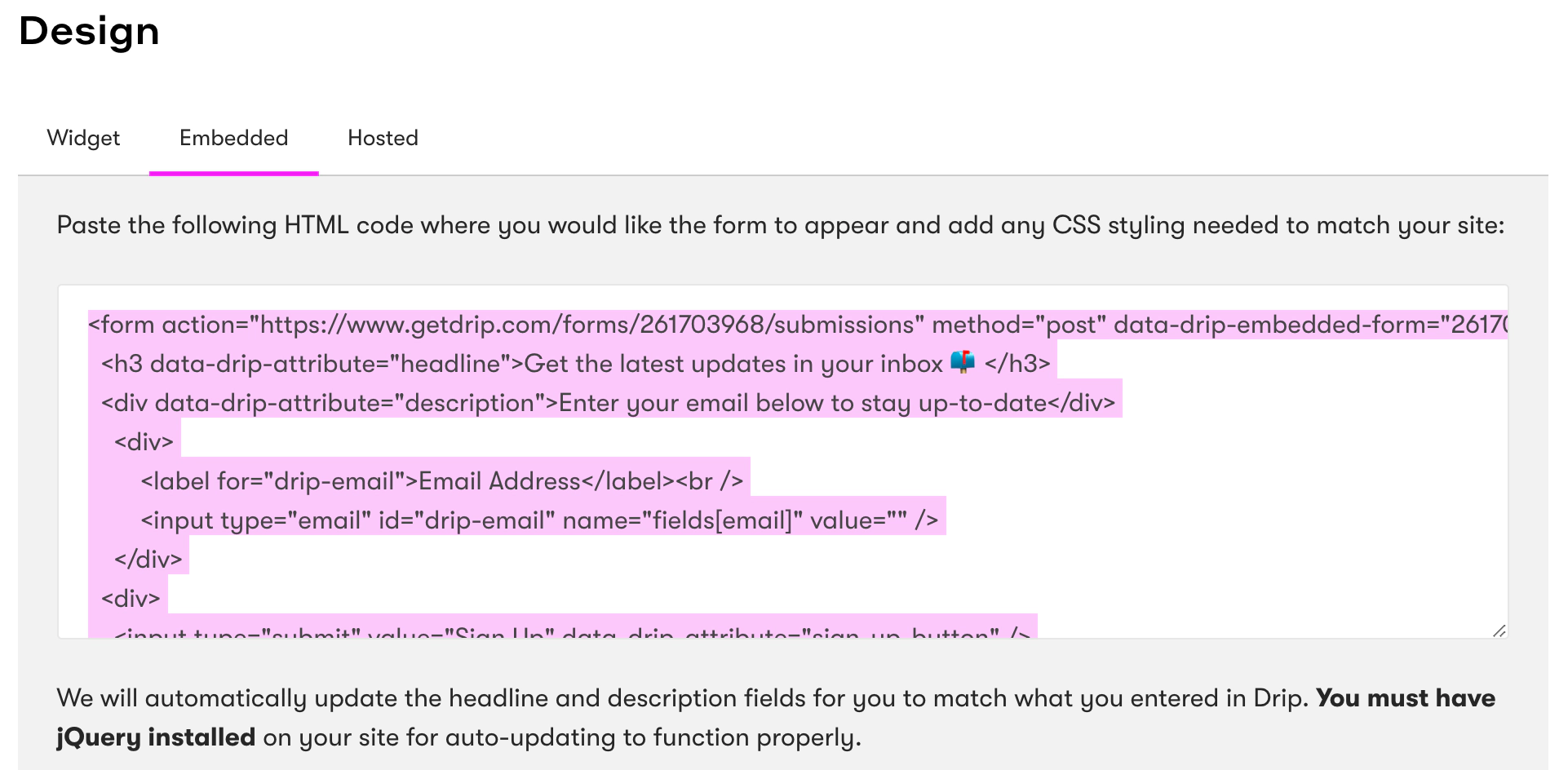 To use HTML embedded forms, locate the embed code from within the form editor in your Drip account: