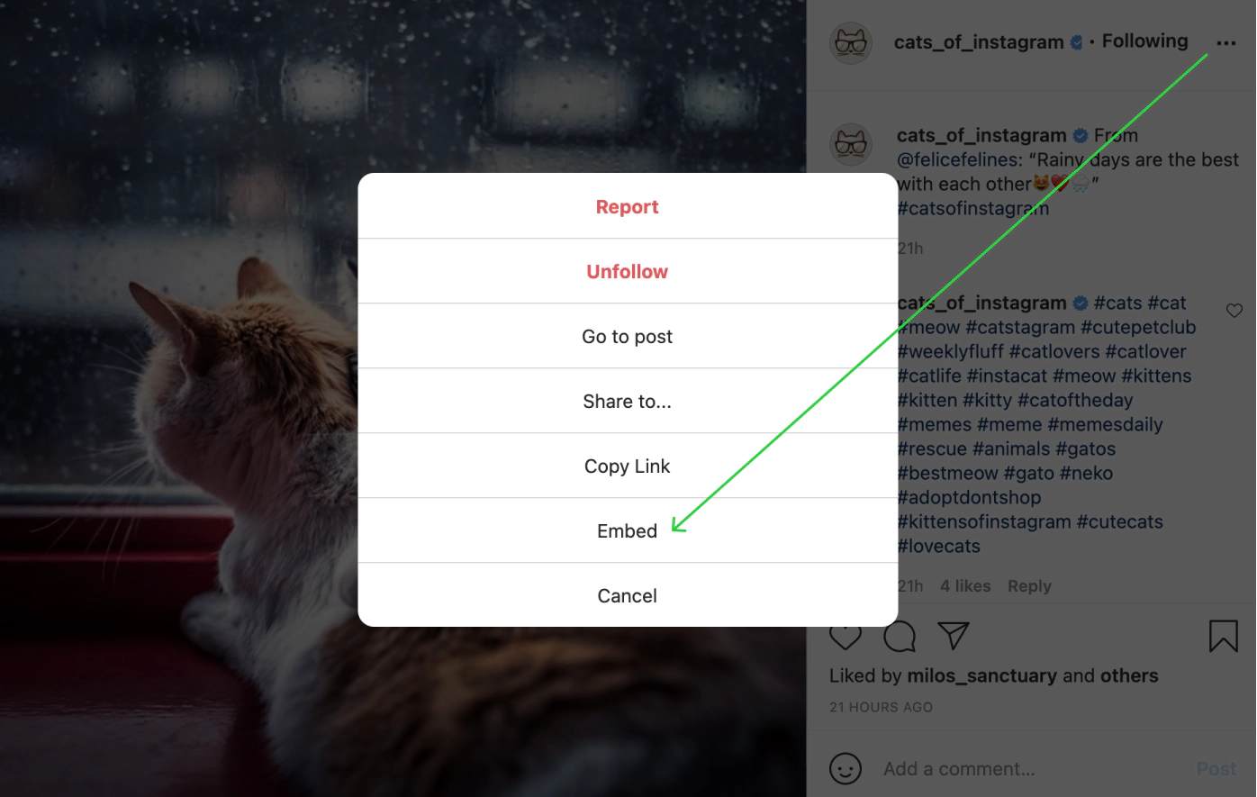 Locate the embed code for the image you’d like to embed by clicking the three dots in the top right corner ... and Embed: