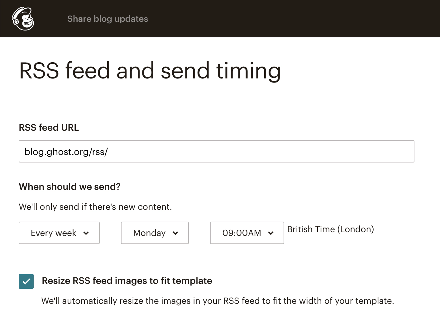 Once you’ve created a new campaign, enter the RSS feed which you’d like to use to populate your newsletter content. Don’t forget: You can add /rss/ to most URLs in Ghost to get a custom RSS feed. Here are some demo examples: