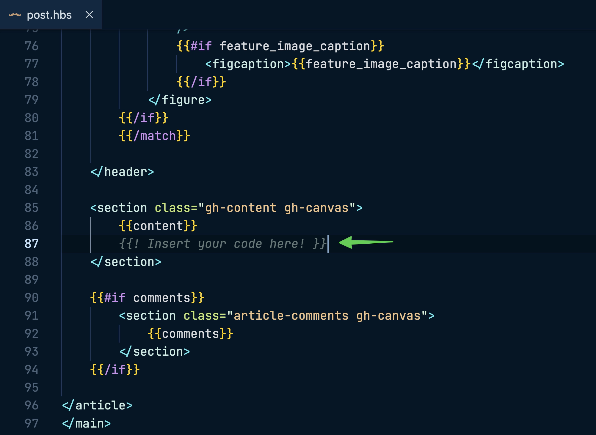 Locate the template file where you want to insert the signup form. It’s usually post.hbs - right after the content. In Ghost’s official themes, add the newsletter signup form after the line that reads {{content}}.
