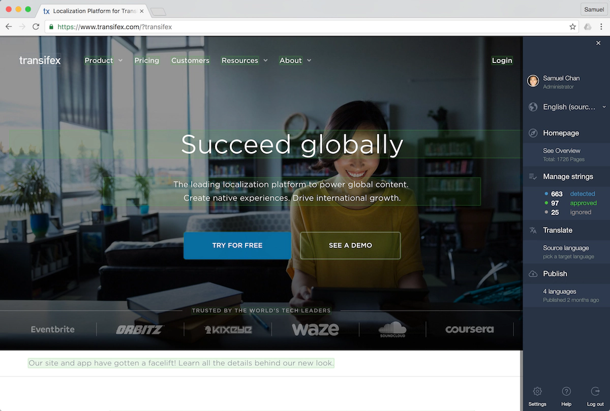 By installing the Transifex onto your site with a JavaScript snippet, your Ghost site becomes instantly translatable. You’ll be able to seamlessly save strings from your website to Transifex, review translations as they appear on the front-end, and publish them - all without any dependencies.