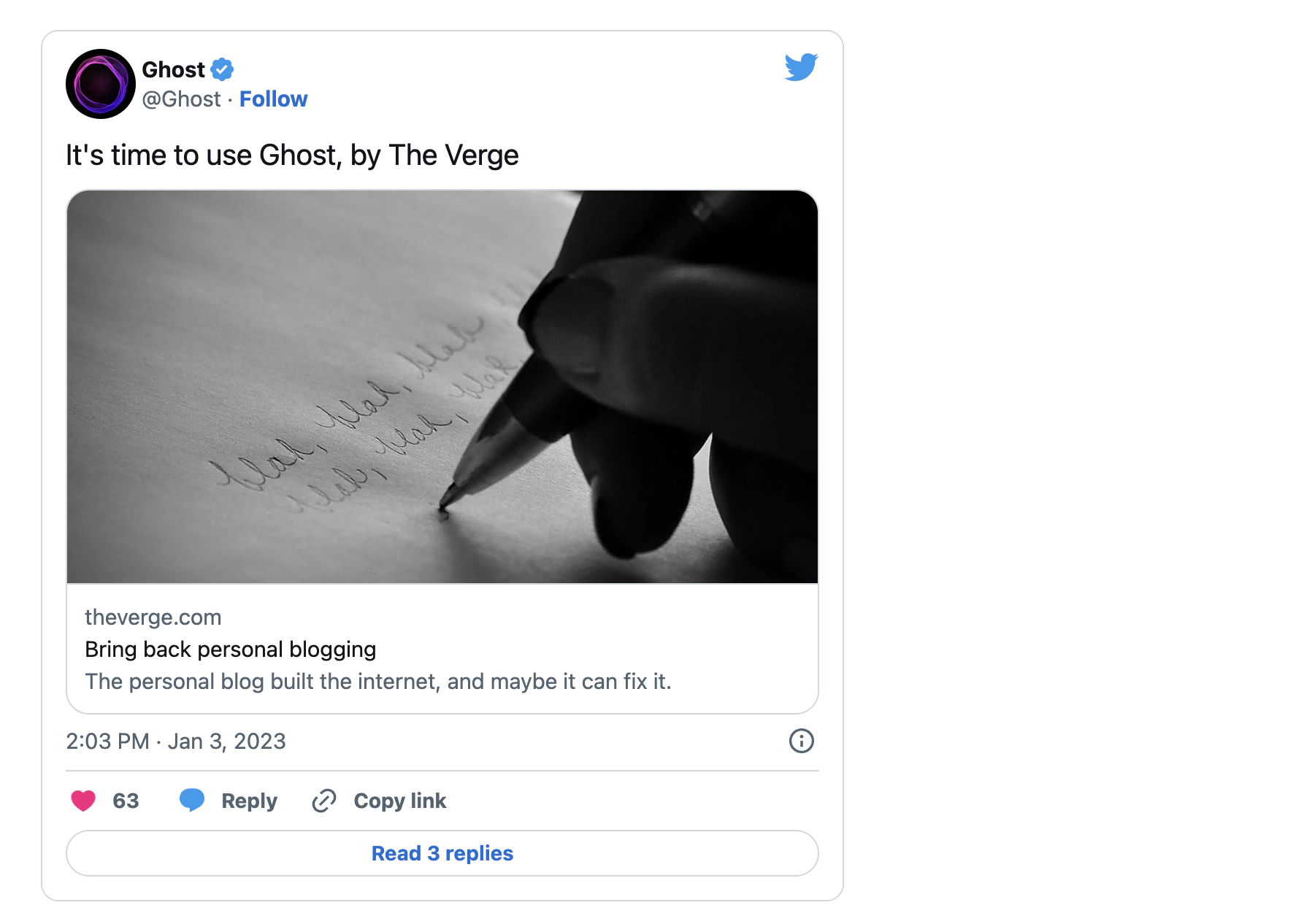 That’s all there is to it! Ghost interacts with Twitter to retrieve the Tweet and automatically embeds the tweets in your posts and email newsletters. Here’s what a Tweet embed looks like: